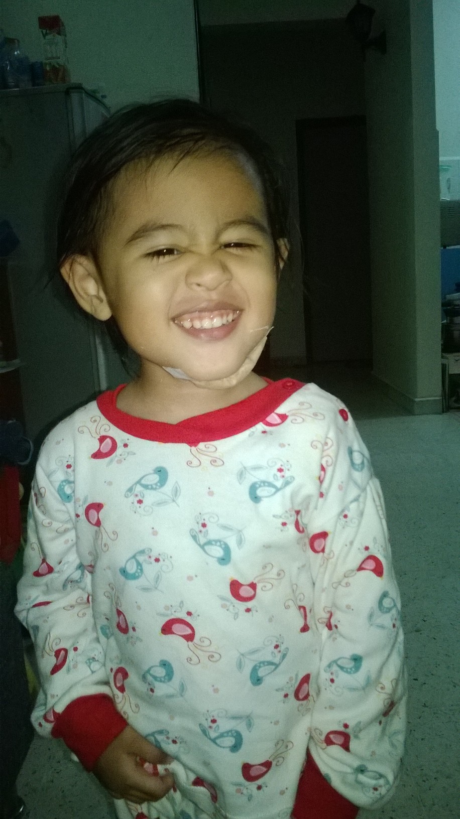 Hari-hari berikutnya memang ga selalu berjalan lancar, tapi alhamdulillah selalu ada jalan untuk membujuk Alma ganti perban dan minum obat. Saya tanya kenapa Alma ga mau ganti perban, dia jawab takut. Pastinya masih ingat dengan ‘kejadian’ di ruang bedah saat insisi. Tapi setelah itu saya bilang, ini perbannya kotor, harus diganti dengan yang bersih, kalau bersih nanti cepat sembuh.. “Bubu cuma ganti aja, Nak. Ga sakit, ga perlu takut. Mau ganti sama tante dokter atau sama Bubu?” Alhamdulillah berhasil.. karena ternyata tante dokter masih lebih ‘nyeremin’ buat Alma daripada Bubunya sendiri, hihi… (See the trace of the trauma here?)