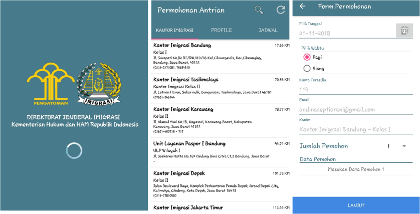 - Download aplikasi “antrian paspor online” lewat hp atau tablet.Β Di aplikasi ini kita harus bikin akun dengan mencantumkan NIK jadi spesifik untuk tiap orang. Bikin akunnya atas nama pribadi, alias diri sendiri, nanti pengajuan paspornya bisa maksimal untuk 5 orang sekaligus; bisa kita termasuk, bisa juga enggak. Kayak saya, bikin akun atas nama saya, tapi ngajuin paspor untuk anak-anak. Nah, ini yang saya bilang tadi di awal, melalui akun ini, kita “ngantri” atau semacam booking jadwal untuk masukin berkas dan difoto. Biasanya pengajuan dibuka hari Sabtu atau Minggu dan kuotanya paling cepet adalah untuk 8-9 hari ke depan (note: Senin siang biasanya kuota udah habis). Kalau mau lebih update lagi, follow twitter Kantor Imigrasi Bandung (@kanimbandung). Nah, kalau sudah berhasil rebutan kuota, dilanjut dengan memilih kantor imigrasi, akan ada jadwal pagi atau siang.